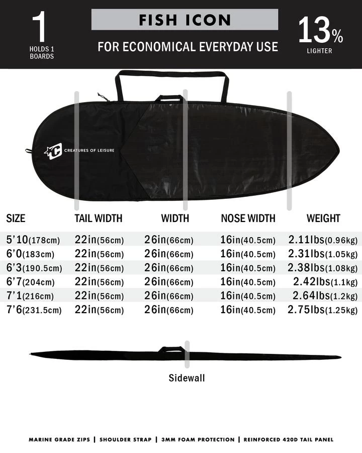 The Fish ICON Lite Boardcover is designed for wider fun boards. The single board capacity covers are perfect for in-home storage or in-car transport to and from the beach.