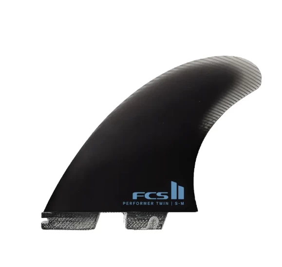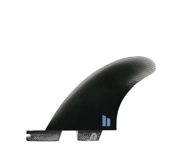 It’s best to think of the Performer Twin as 2/3 Twin and 1/3 Thruster. The side fins are at the lower end of the S-M size category and have a neutral sweep angle (Performer Family) and a streamlined outline from base to tip. The stabiliser, which has a higher sweep angle (Carver Family), is oversized compared to most stabiliser fins which increases the combined surface area of the set, but more importantly, adds significant control when surfing.