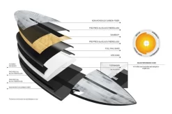 The internal carbon framework is designed specifically to suit each template, and by switching to epoxy resin and adding a carbon twill to the base we’ve delivered a more user-friendly flex pattern. Stiffness in the lower half of the fin enhances drive and acceleration from take-off, and a softer flex through the top half of the fin results in a smoother and more predictable feel when turning.