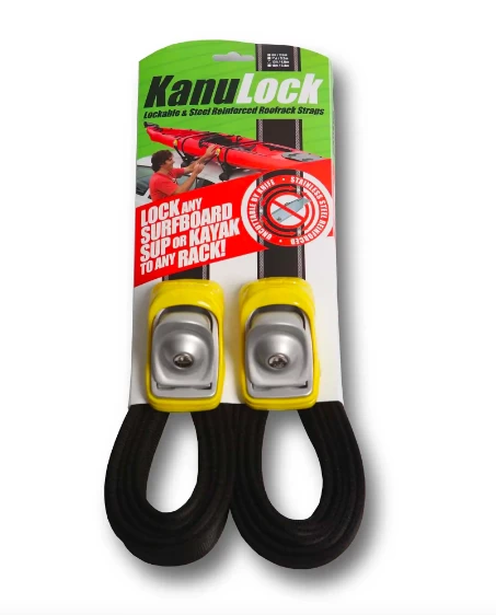 Kanulock Lockable Tie-downs stop opportunistic theft. A thief cannot simply walk off with your board or kayak, the buckles can be locked securely by a key, your board or kayak cannot be slid out, the straps are reinforced with stainless steel cables and can’t be cut by a knife. KanuLocks are a great theft deterrent.