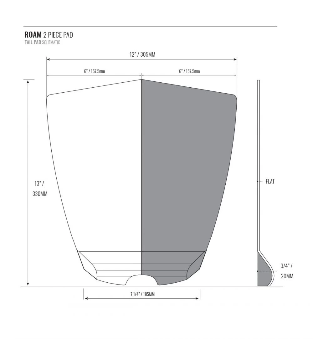 The 2 piece is designed for wider tailed boards. The pad is flat with no arch, featuring our lowest kick tail and square grooving to allow easy movement and repositioning of the back foot. This is a great pad for boards that are surfed less aggressively; fishes and skatey boards, particularly where you are surfing fairly front footed to gain speed and need adjust your position on the board. It offers plenty of grip when you do lean into a turn and push hard through the tail.