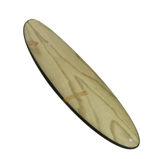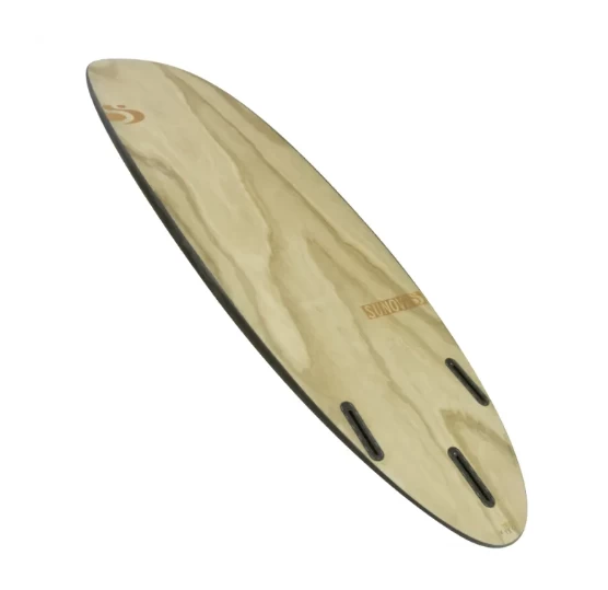 The deck is quite flat because the volume is low but the rails carry thickness. Comfortable to ride, the board carries more thickness into the nose and tail. The combined area and flat rocker all help to keep the board moving regardless of body position on the board.