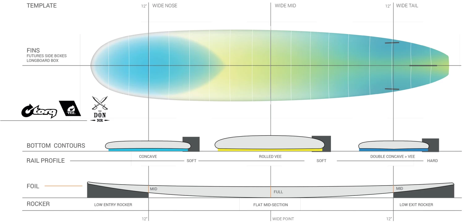 The Don Nose Rider is a mix of our all round performance Don model with a more traditional Noserider. Up front is a wide nose, low entry rocker and teardrop concave – a sure fire combination for stability and tip time. But unlike a traditional noserider with soft rolled rails and vee bottom, the Don NR combines a hard rail and double concave vee in the tail of a more modern longboard.